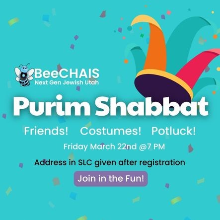 Join BeeCHAIs: Next Gen Jewish Utah for a Purim themed Shabbat dinner! Connect, engage, and relax as we bring in Shabbat together. Costumes are strongly encouraged and please bring something delicious to share - Kosher fish/vegetarian only please.