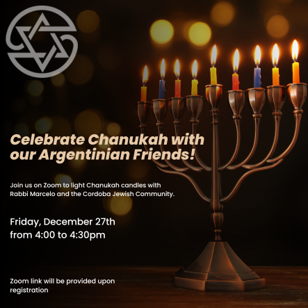 Join us on Zoom as we light Chanukah candles with Rabbi Marcelo and members of the Cordoba Jewish community. We will gather with the Rabbi and members of his community, along with those from our Federation, who traveled to Cordoba in 2022. Join us for this international candle lighting as we come together as one community to sing, to share, and to celebrate.
