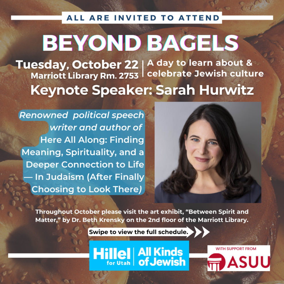 Join Hillel for Utah for Beyond Bagels, a day to learn about & celebrate Jewish culture! Marriott Library, Rm 2753