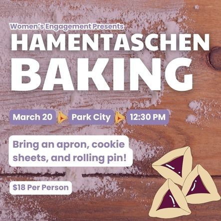 Join Women's Engagement for a Hamantaschen lesson and baking session! This event will occur in Park City, with the address given after RSVP.